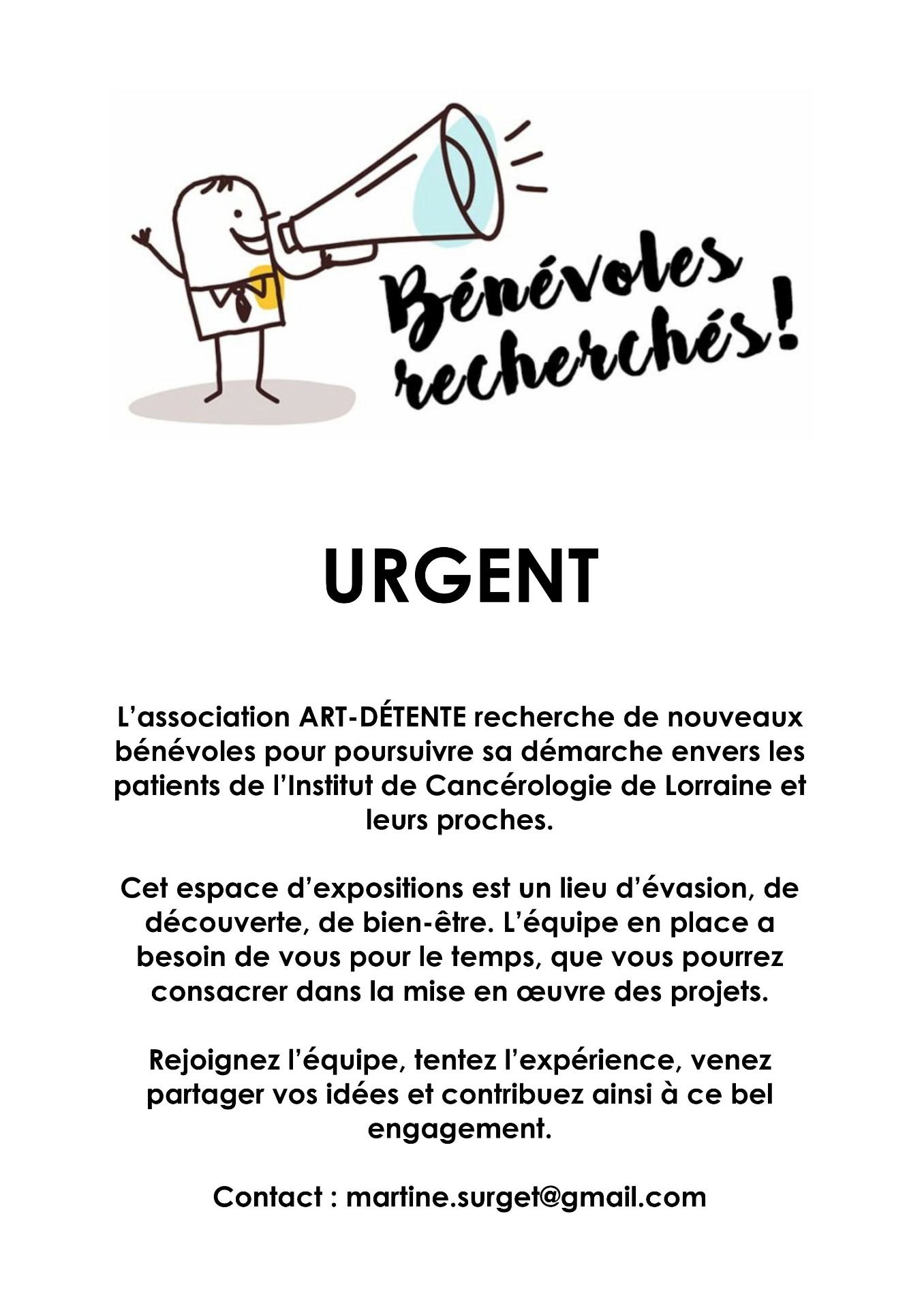 Art-Détente est présente à l'Institut de Cancérologie de Lorraine depuis près de trois décennies. Un espace, situé près de l'accueil de l'établissement, est dédié aux expositions, dont les thèmes varient chaque mois. L'objectif de l'association est d'aider les patients hospitalisés à sortir de leur chambre et venir les découvrir dans un lieu intime et paisible, propice à l'évasion. De tout temps la maladie et l'art ont quelque chose à se dire.